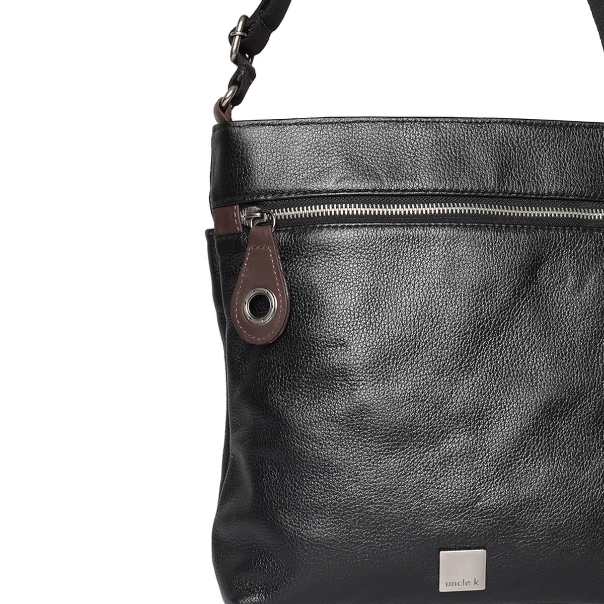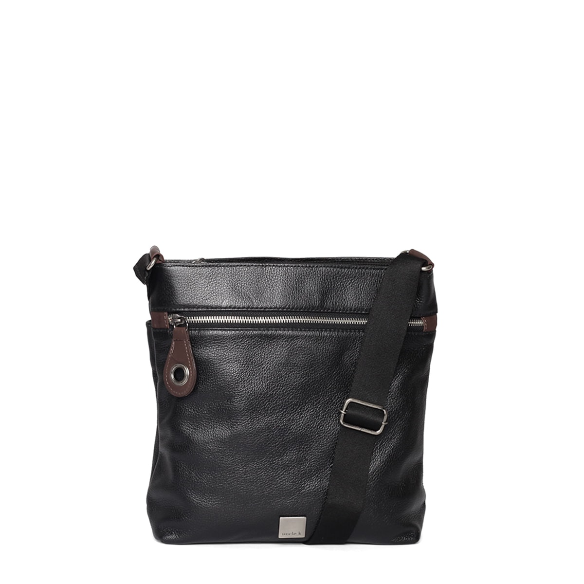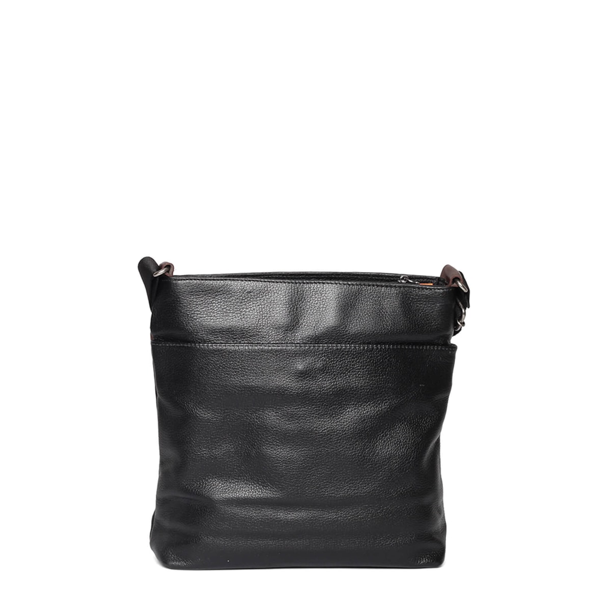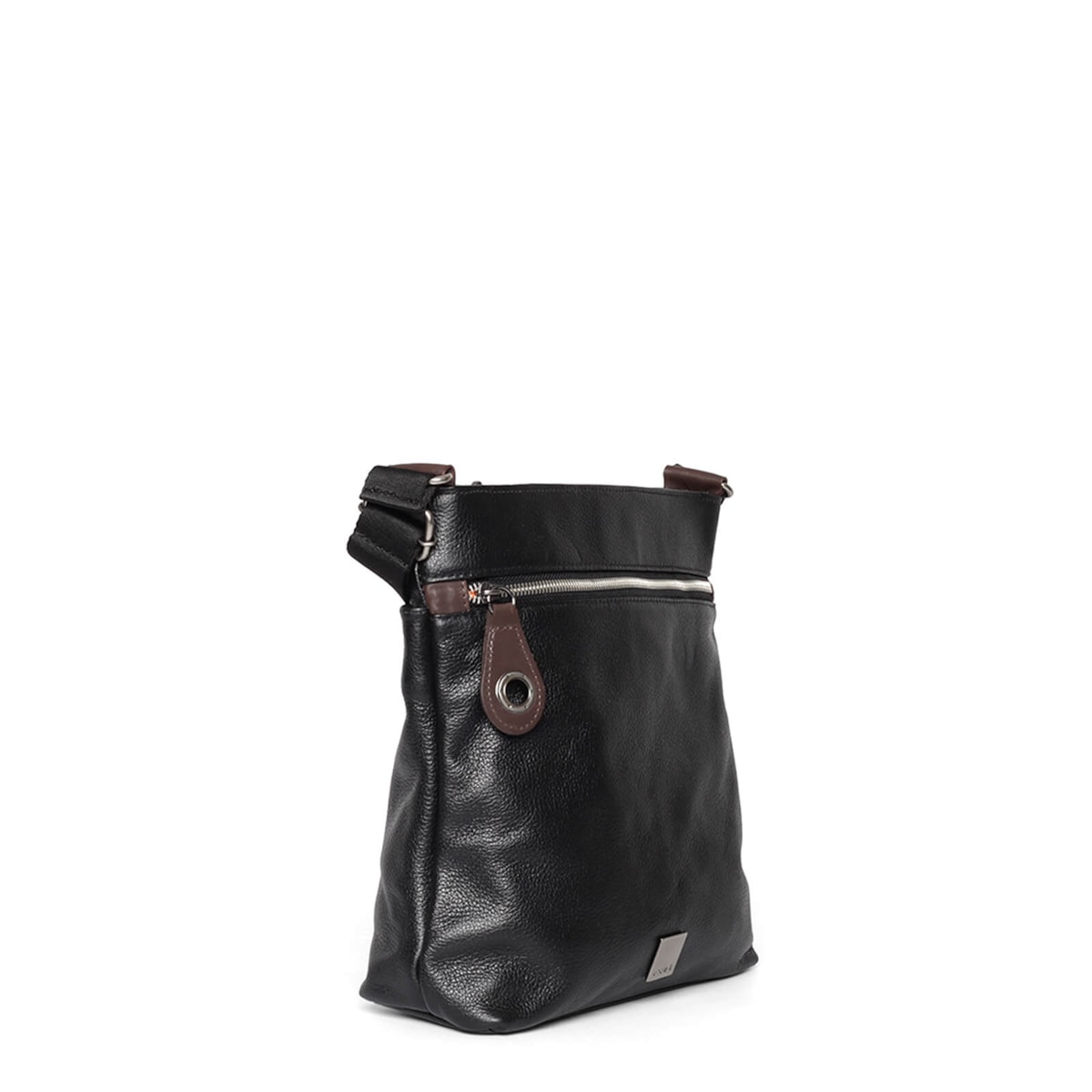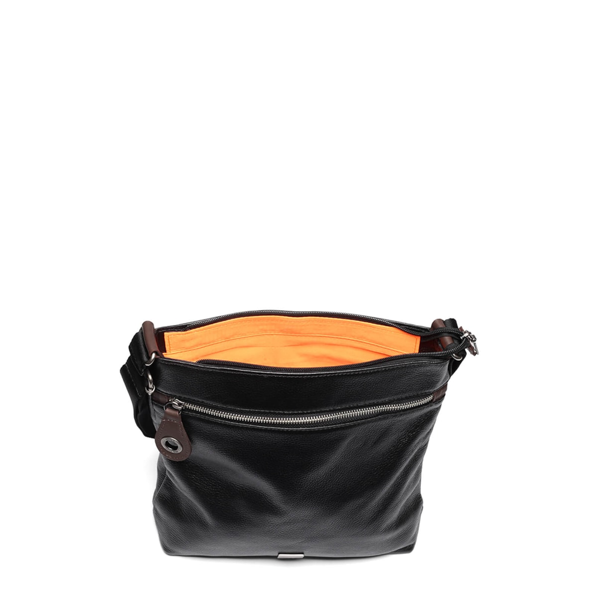 Bolsa média de couro no estilo tiracolo. Possui alça regulável e porta-chaves. Fecho principal em zíper. Bolsos internos e externos.