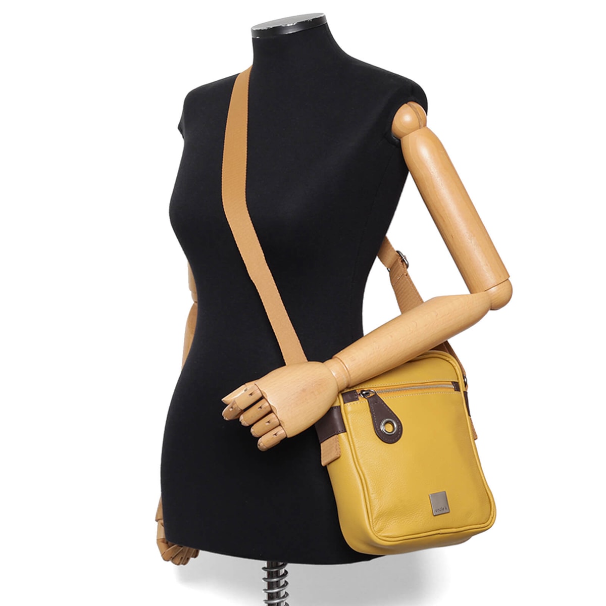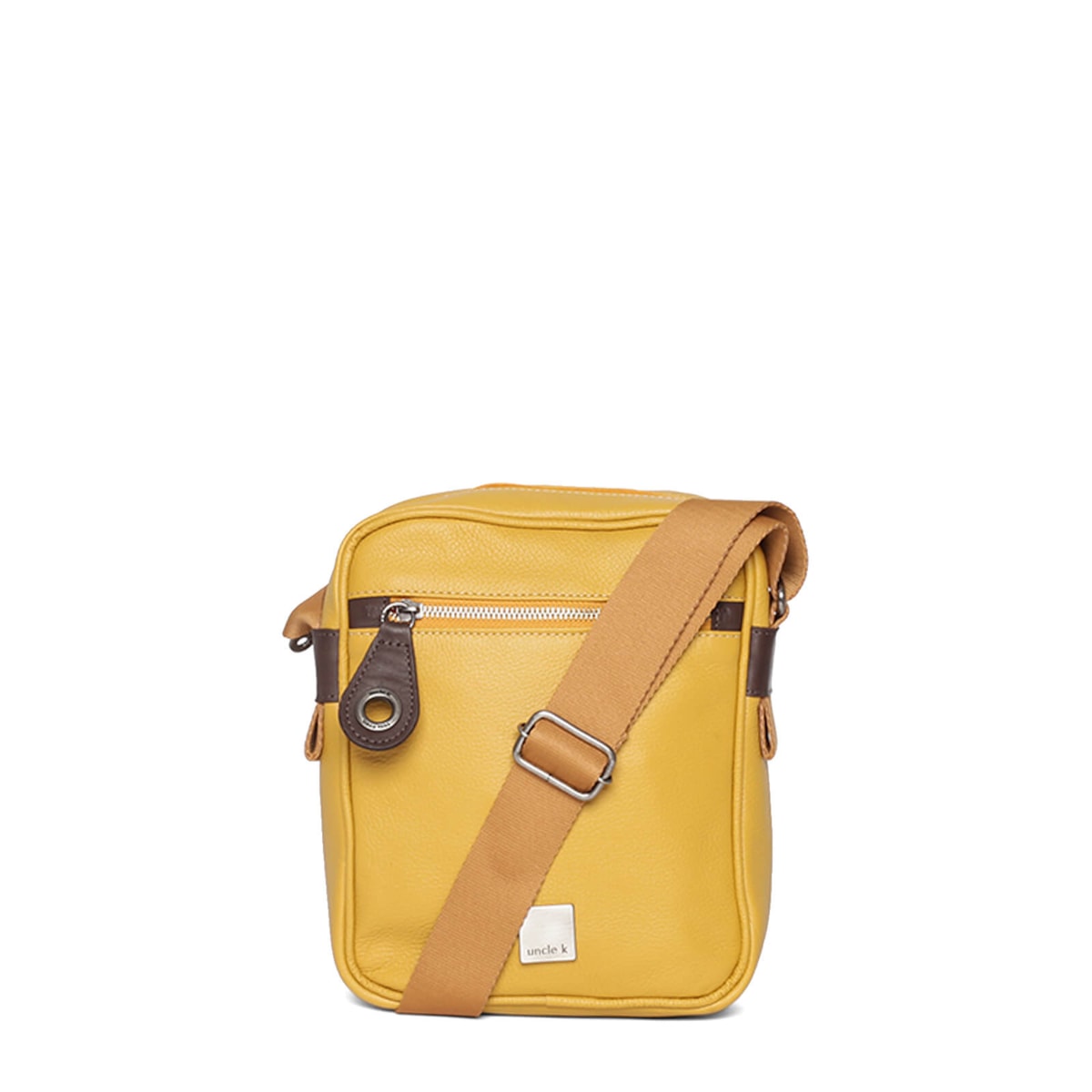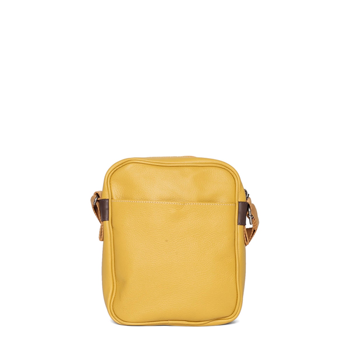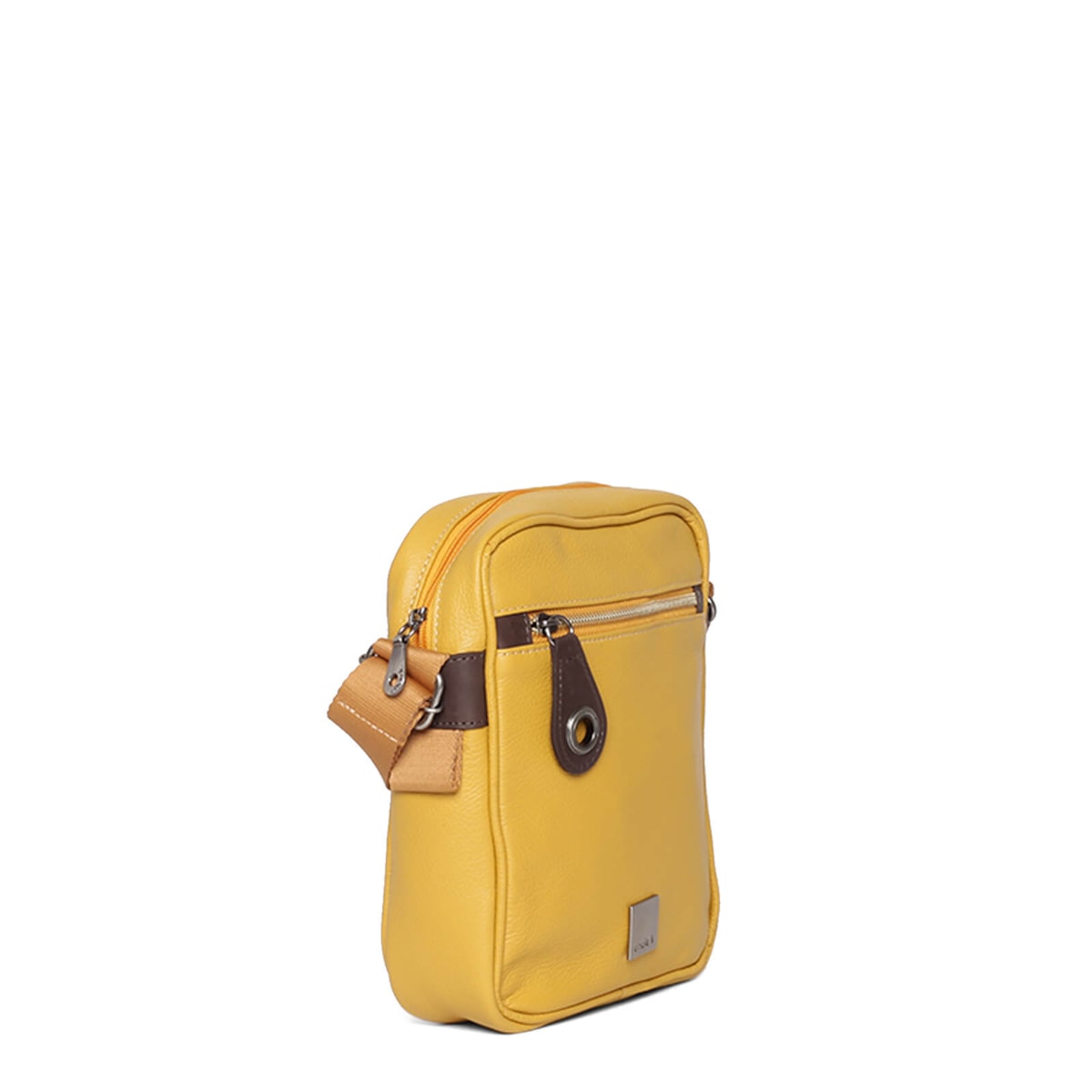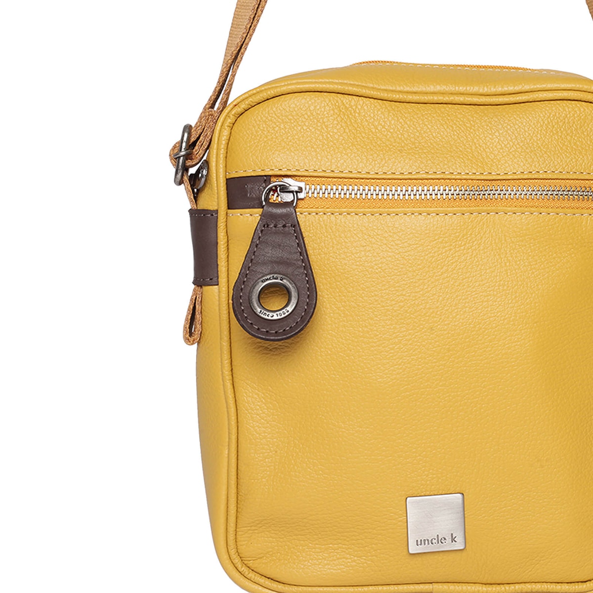 Bolsa de couro no formato tiracolo com bolsos externos. Alça regulável e fecho principal em zíper. Possui porta-chaves.