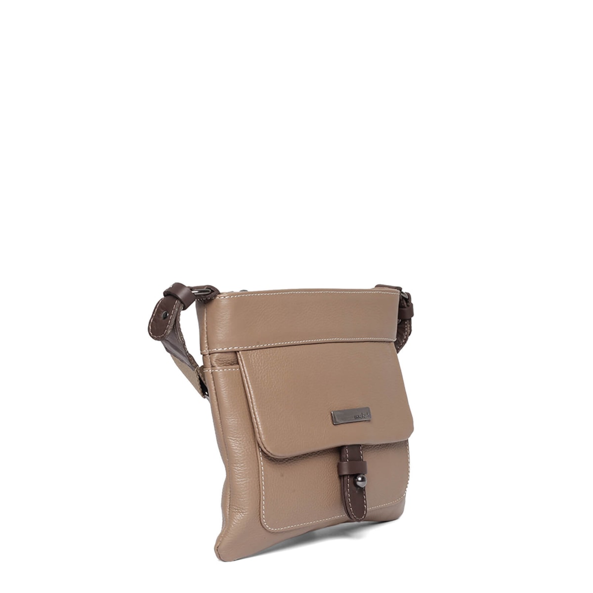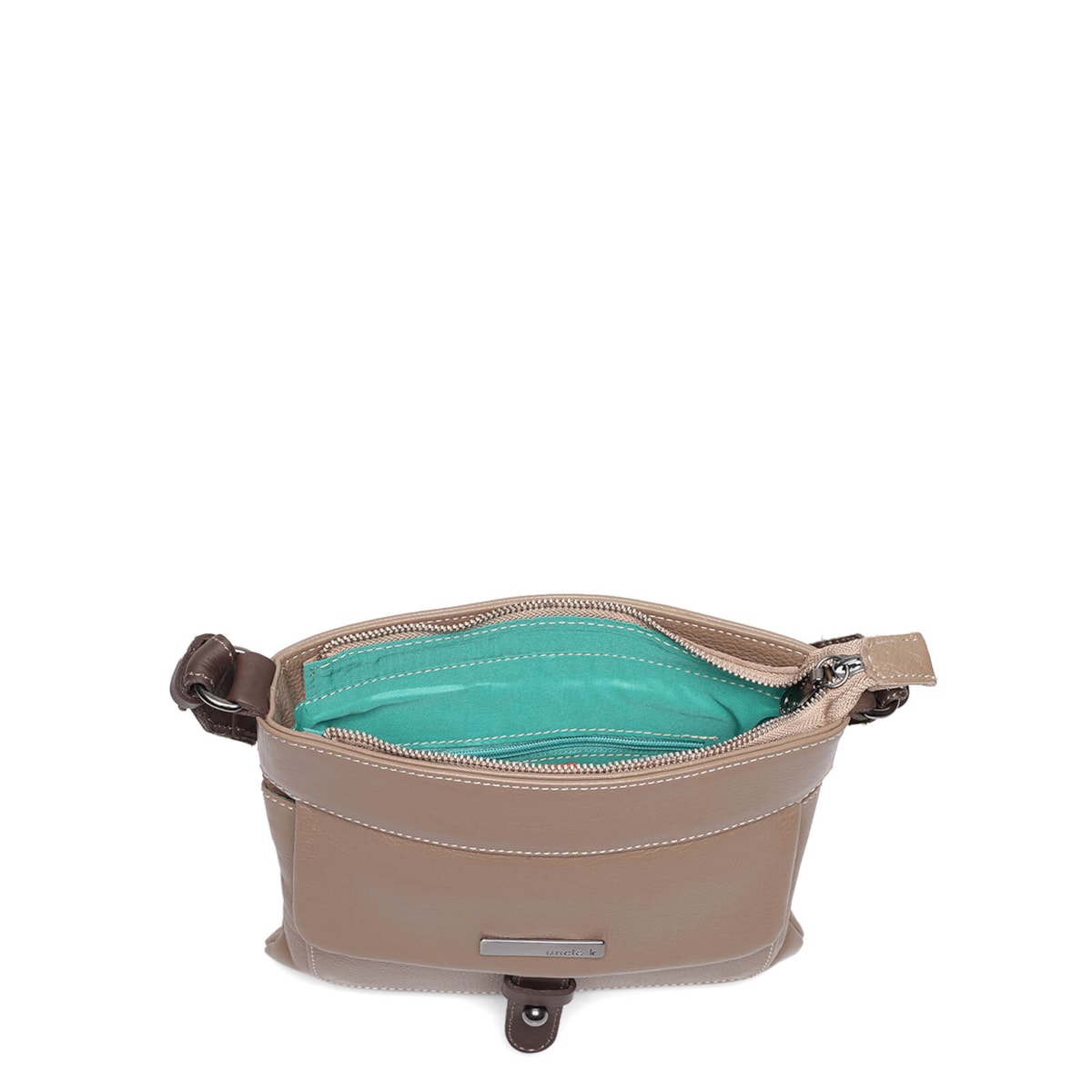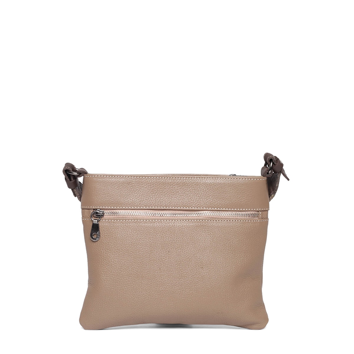Bolsa em couro com bolso externo e interno. Fecho principal em zíper e ímã. Alça regulável.