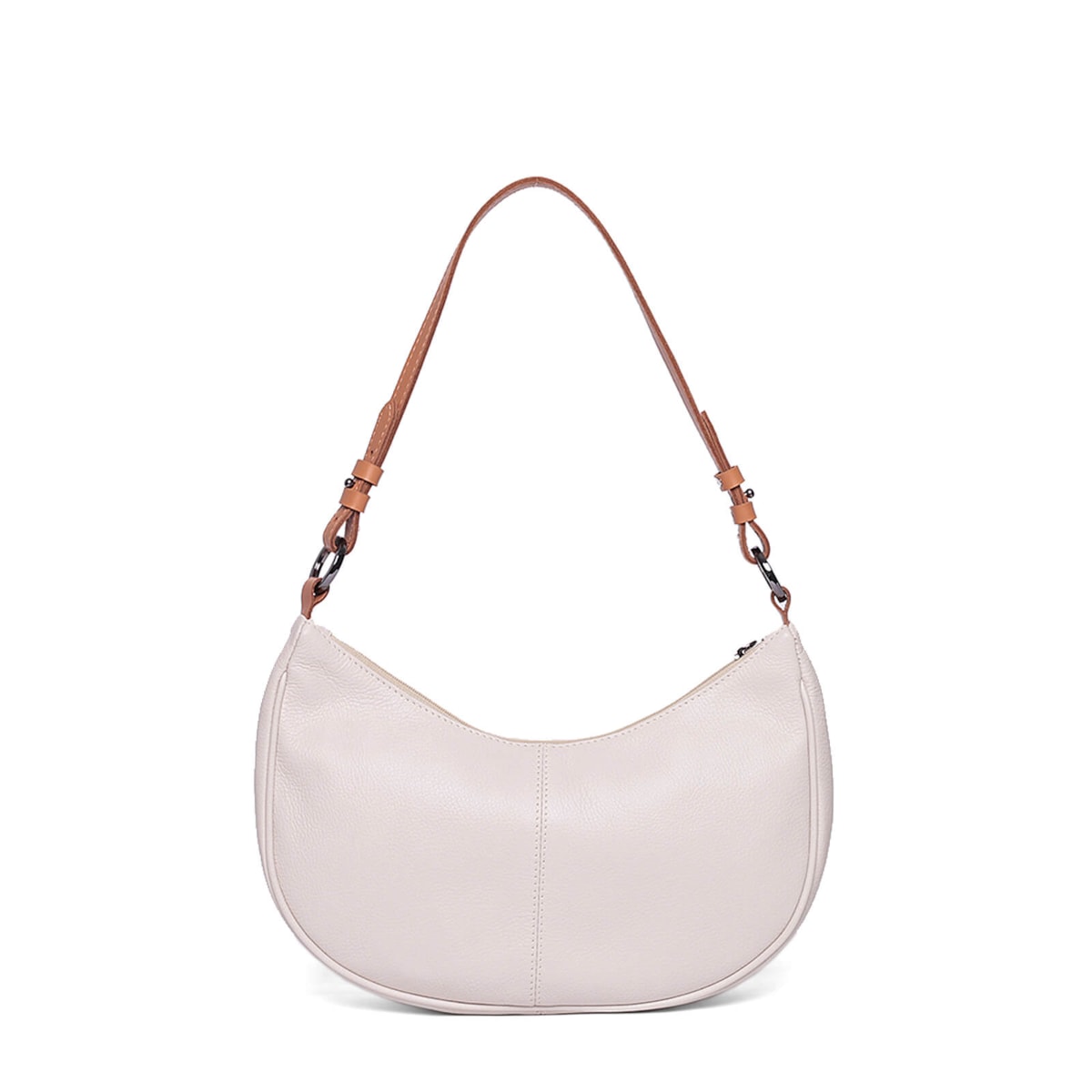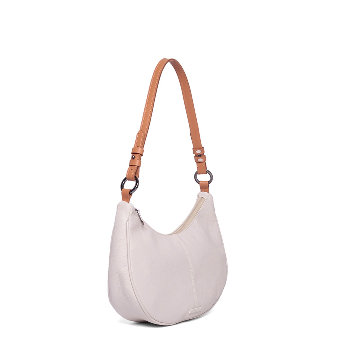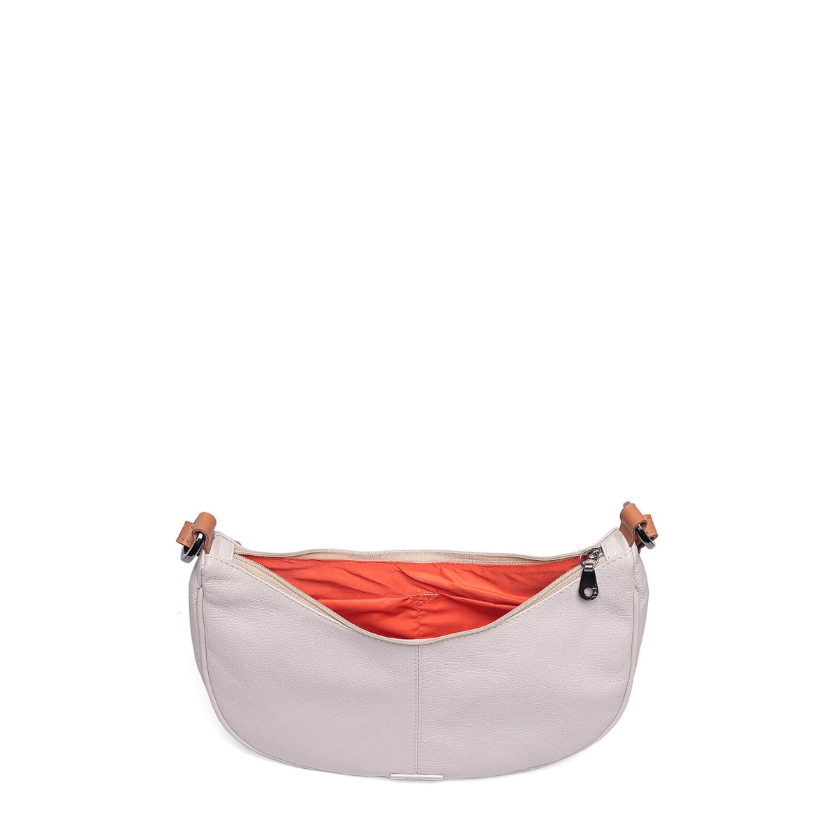 Bolsa ombro couro 61262 v25 feita de couro com design em formato meia lua. Conta com alça regulável para ajuste perfeito, fechamento em zíper para segurança, dois bolsos internos para facilitar a organização e um prático porta-chaves.