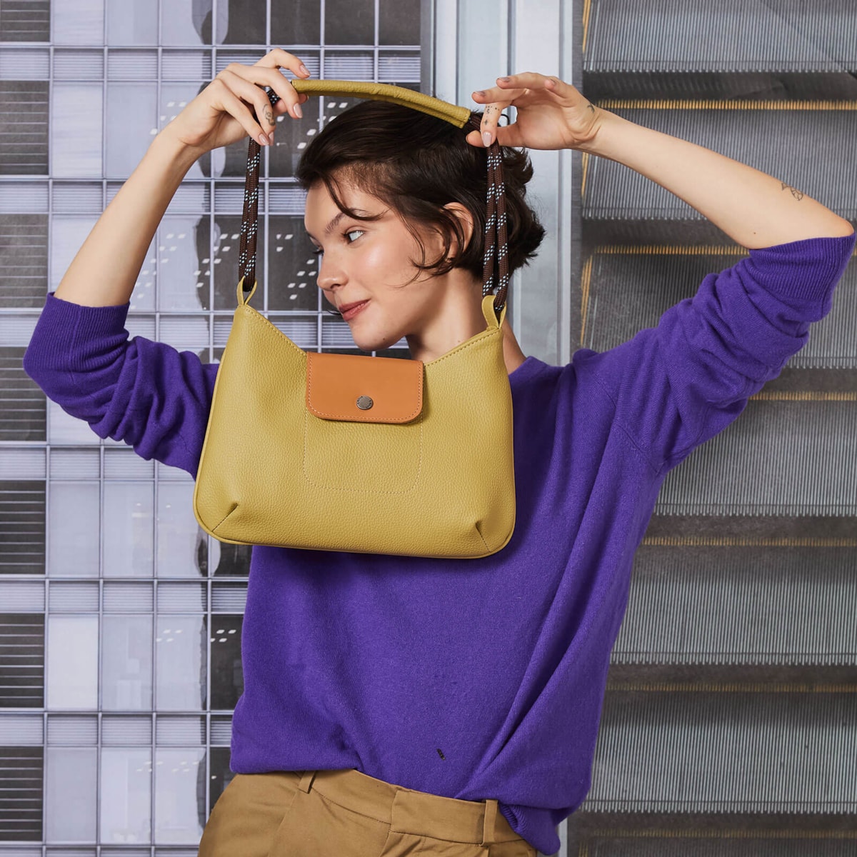 Bolsa pequena de ombro feita em PU, com tampa em couro atanado e fechamento por botão imantado, unindo estilo e praticidade. A alça de corda, com uma parte revestida em PU, proporciona mais conforto no uso. Internamente, a bolsa é toda forrada e possui um bolso com zíper, ideal para manter pequenos itens organizados.