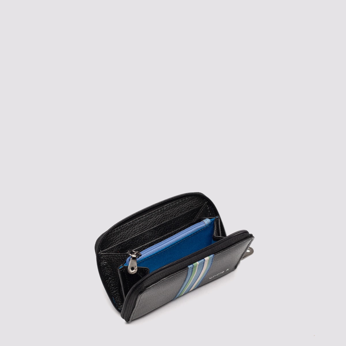A carteira couro 70512 v26 conta com fecho principal em zíper e compartimento interno específico para moedas.