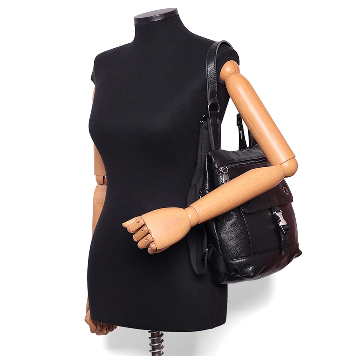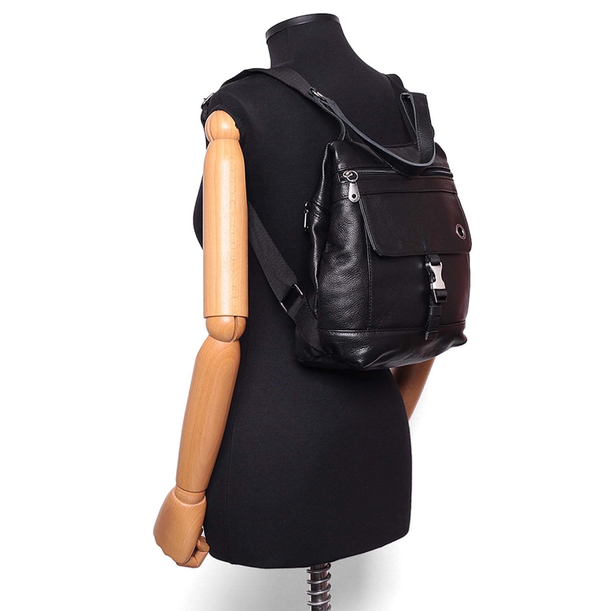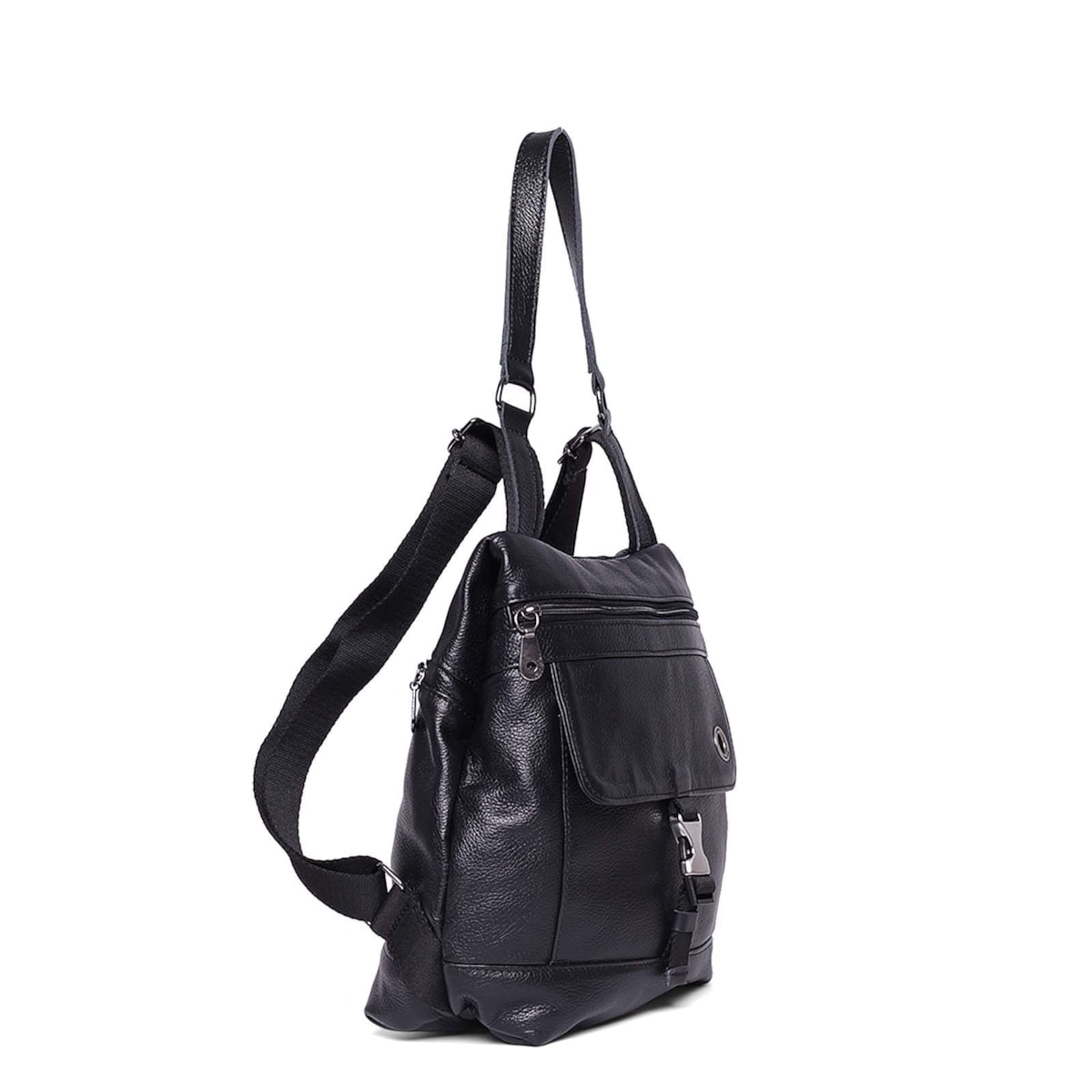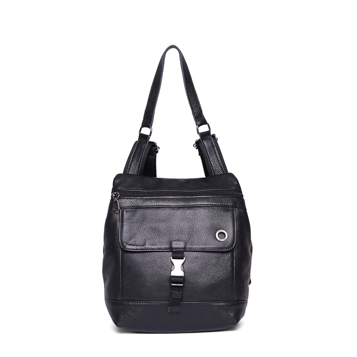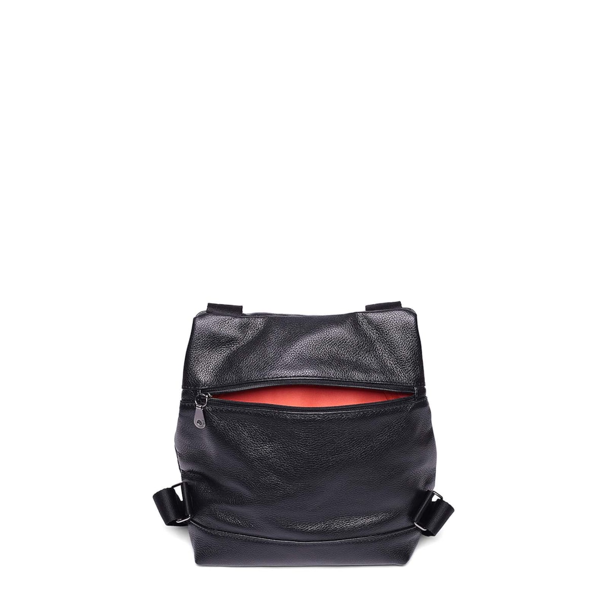 Mochila pequena de couro 61099 v24. Modelo com bolso antifurto traseiro, abertura frontal com fecho em zíper, bolsinhos internos e porta-chaves. Fecho de engate na tampa com bolso frontal e detalhe da marca em ilhós.