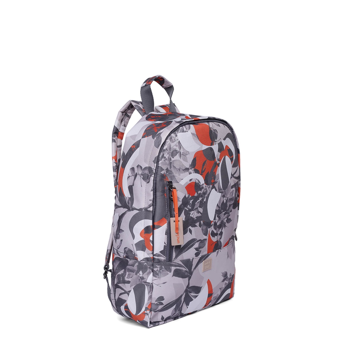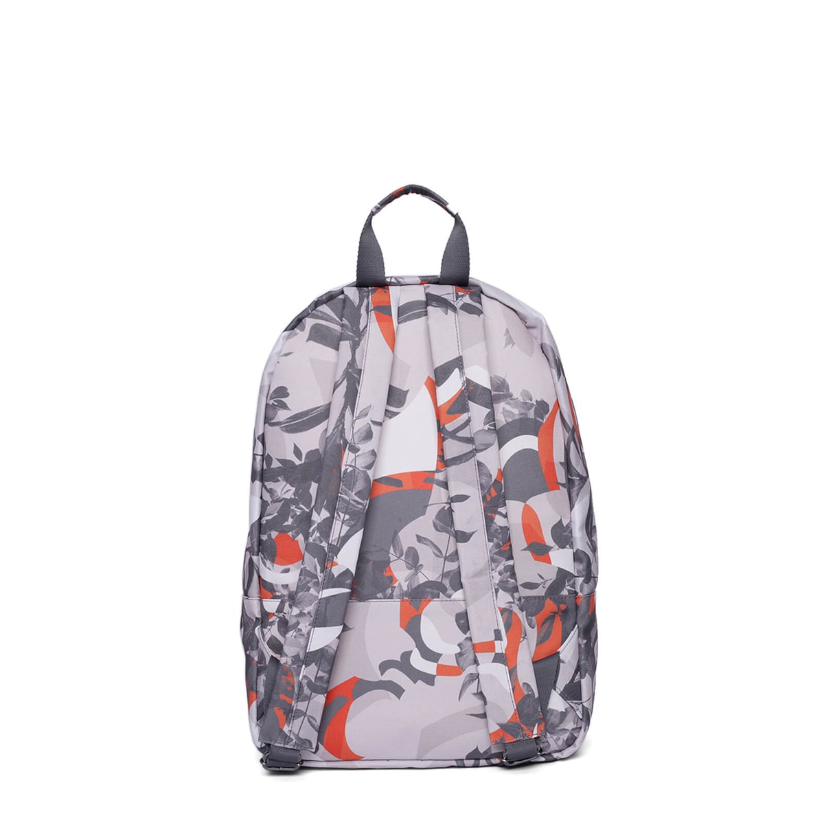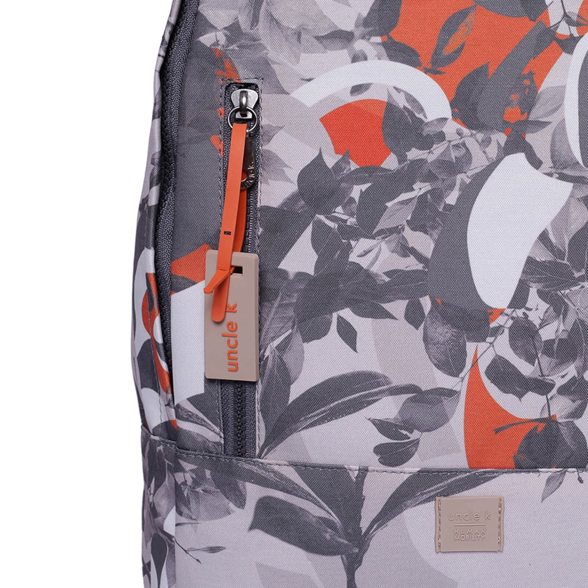 Mochila nylon estampada com bolso frontal e ziper em metal, compartimento interno para notebook e alças reguláveis.