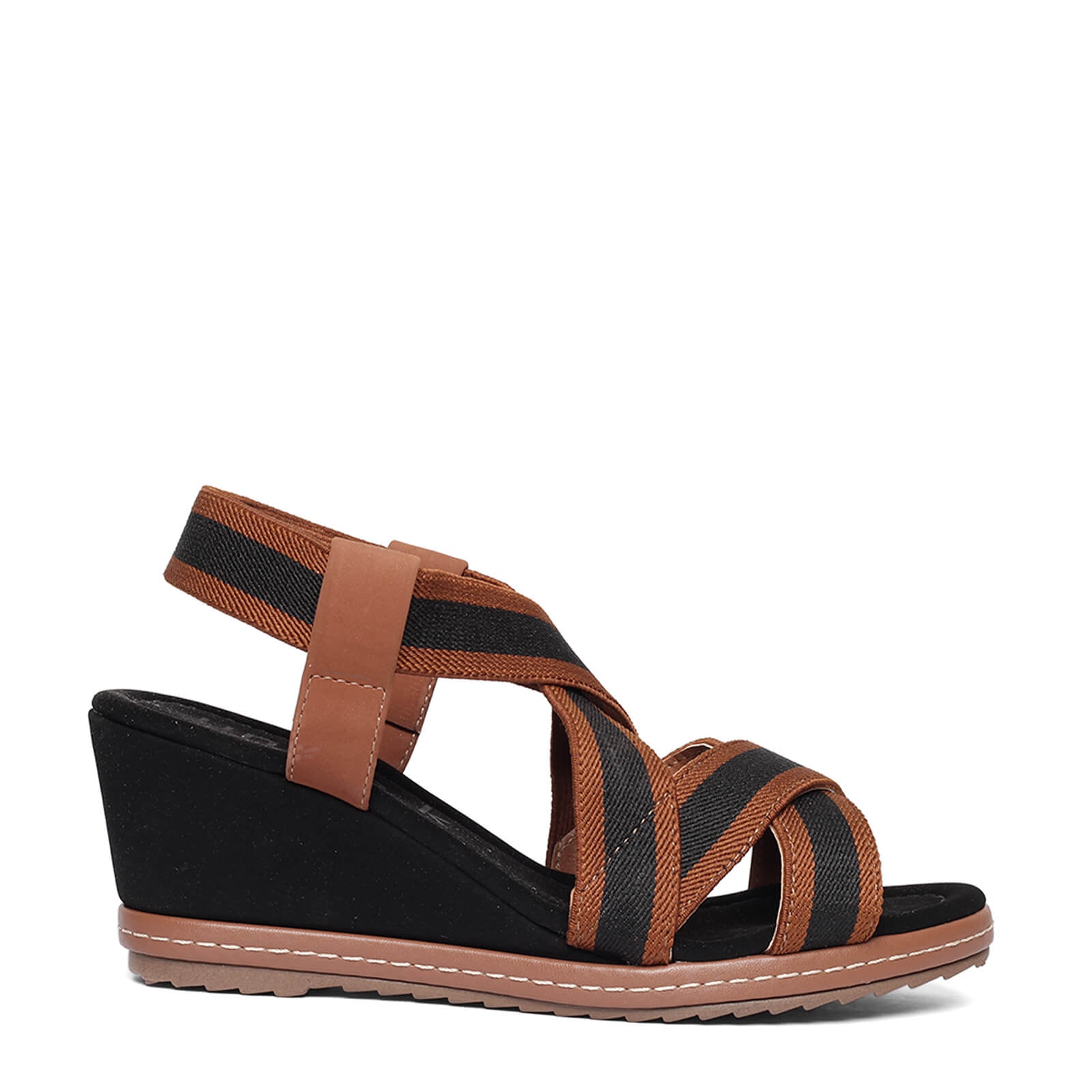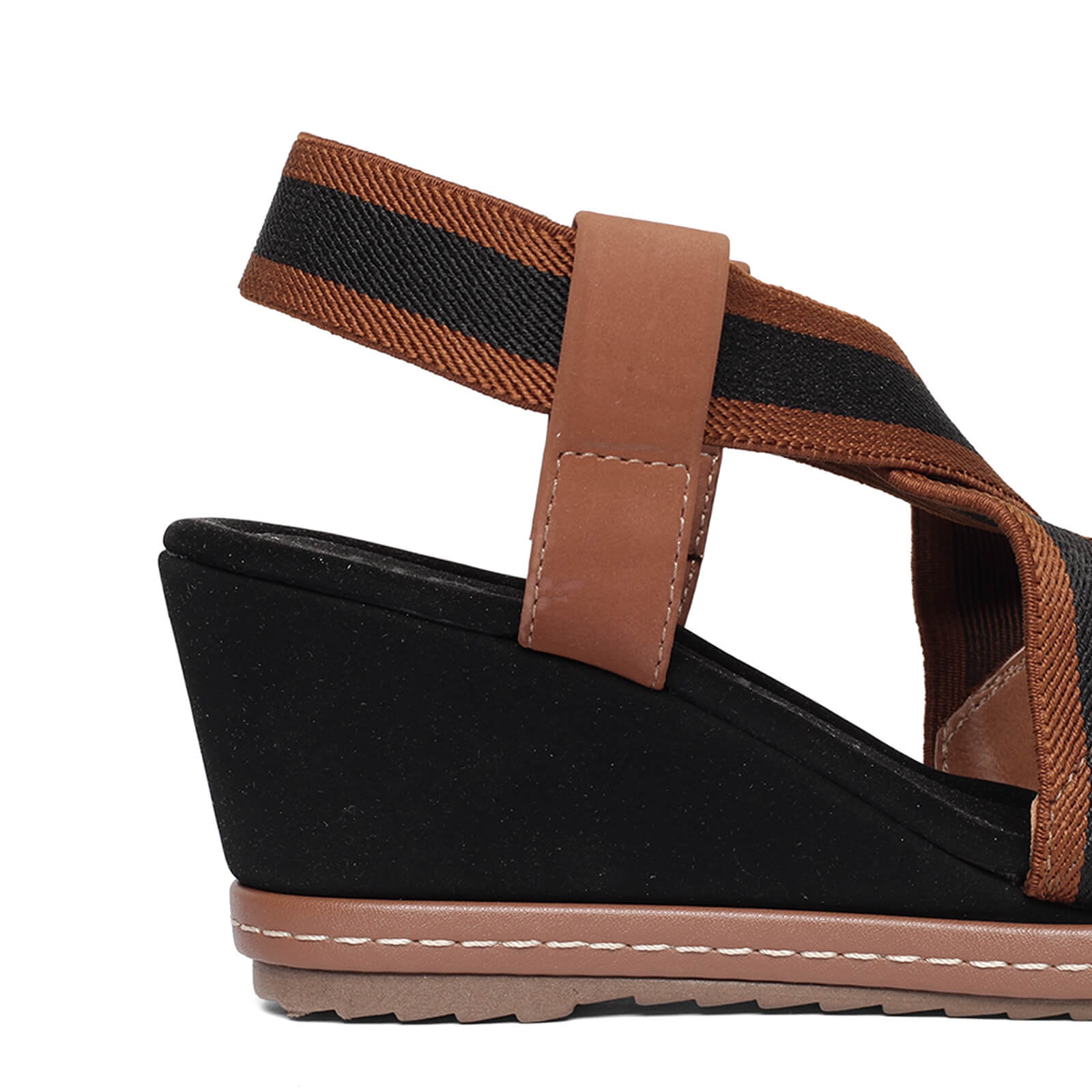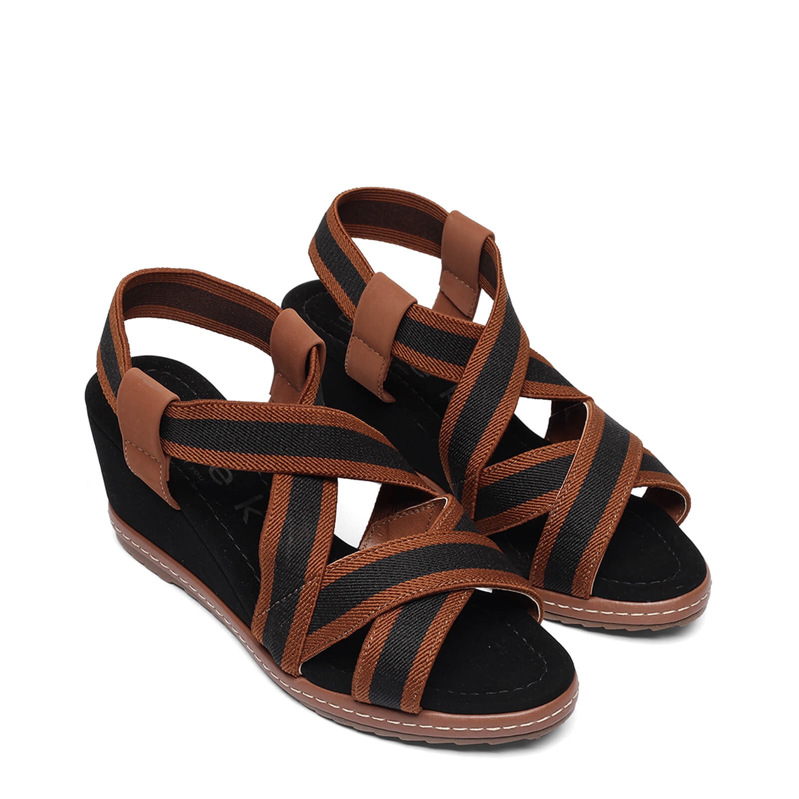 sandália anabela elástico valen v23 com solado em borracha, salto em camurça e tiras de elástico bicolor.