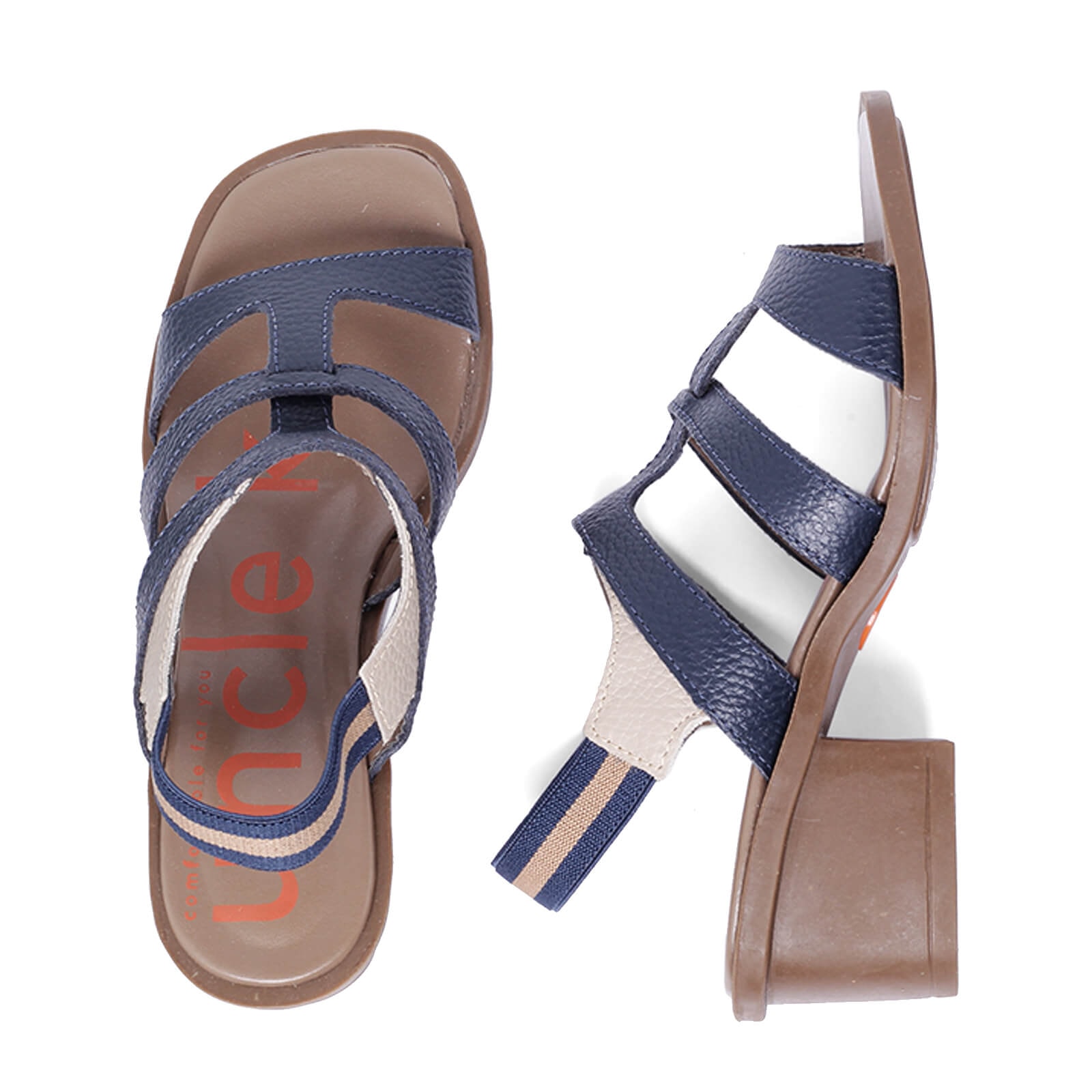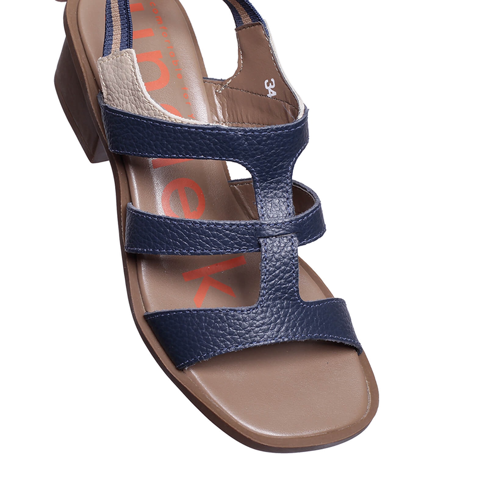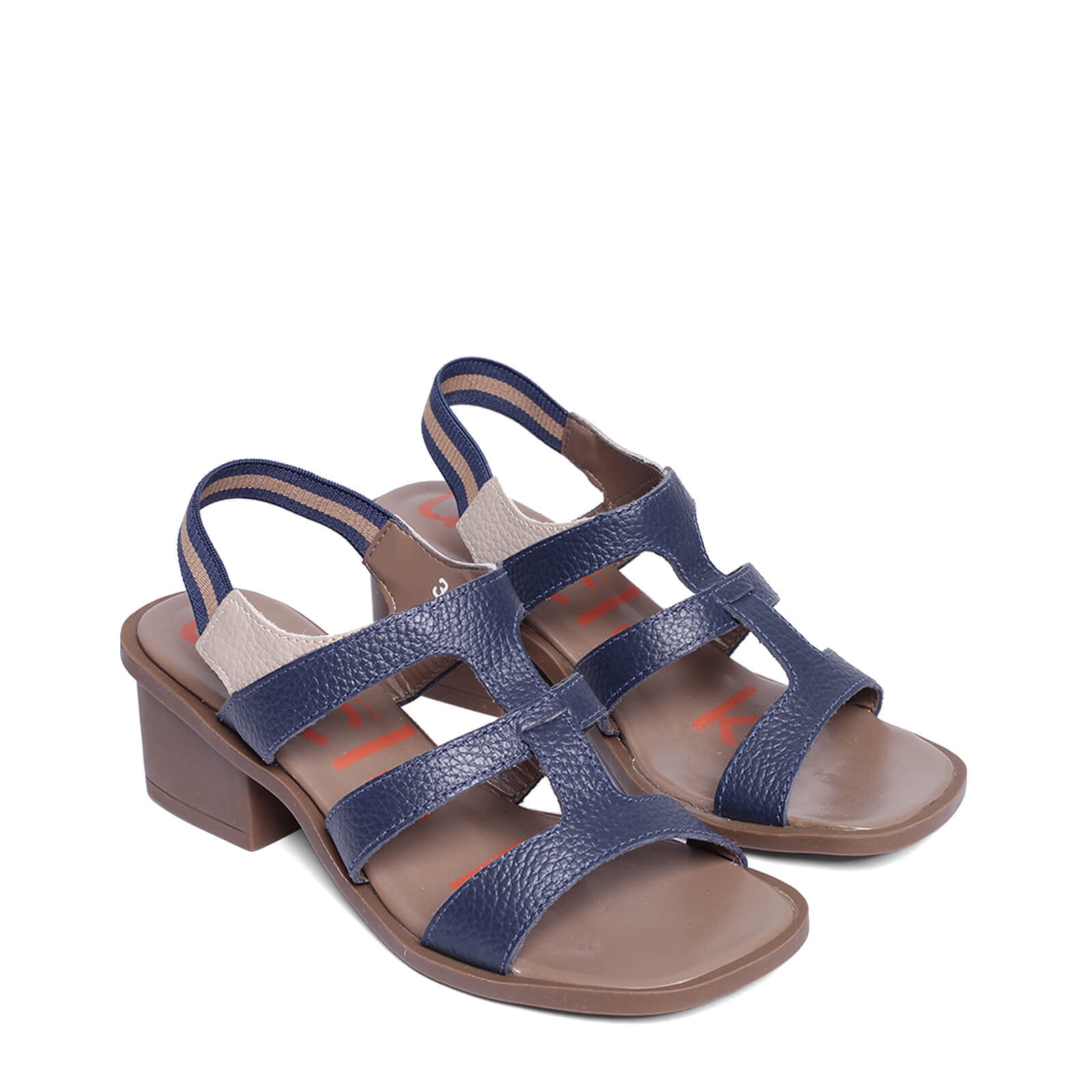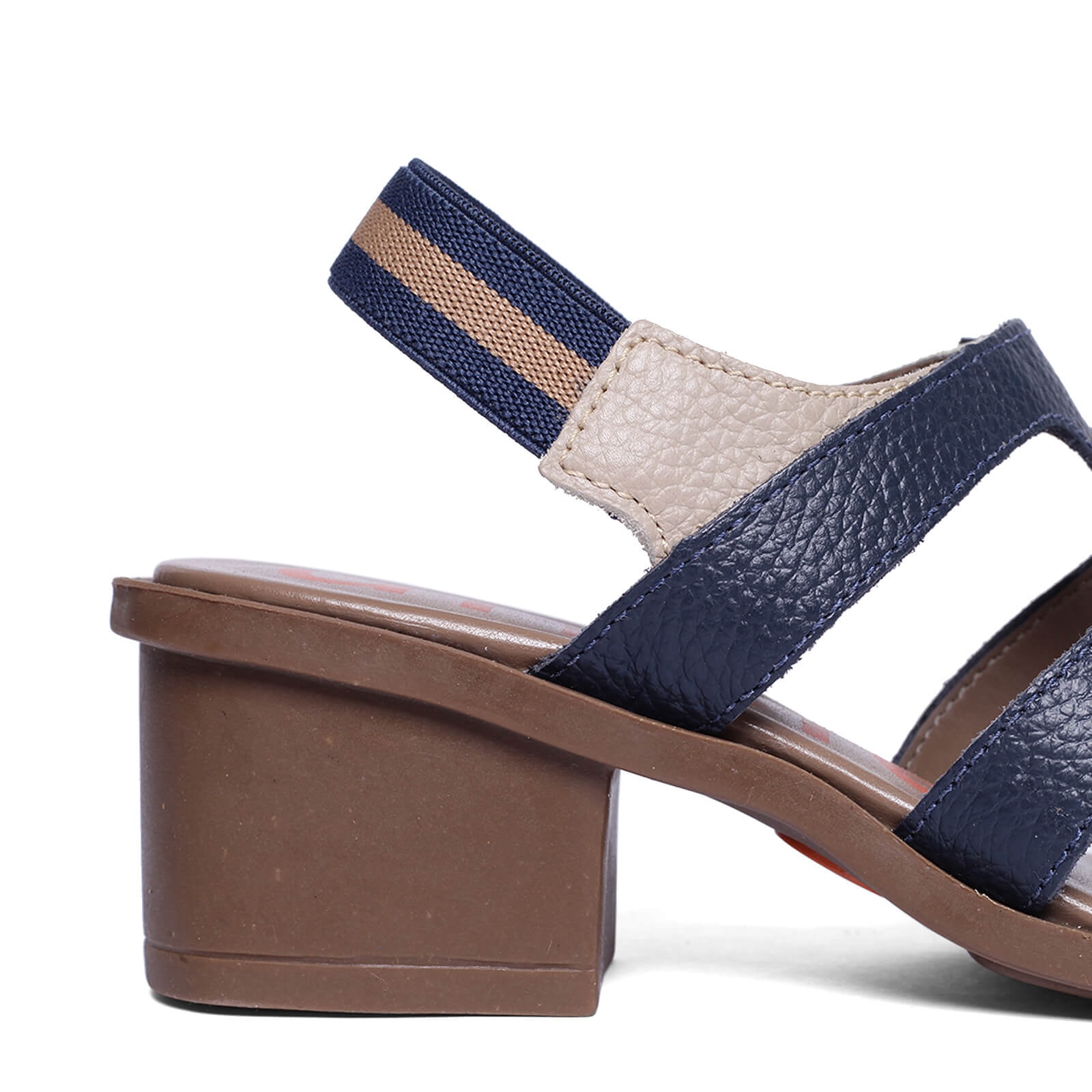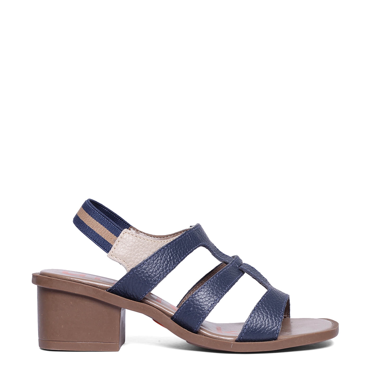 Sandália Comf com salto de couro vazada e elástico traseiro.